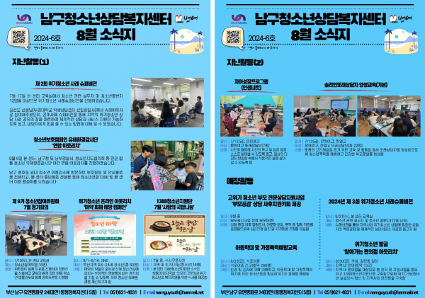 8월 소식지 페이지 정보 작성자 최고관리자 작성일24-09-03 15:39 조회96회 댓글0건 이전글 다음글 답변 목록 본문 남구청소년상담복지센터·남구학교밖청소년지원센터 8월 소식입니다:) 댓글목록 등록된 댓글이 없습니다. 이전글 다음글 답변 목록