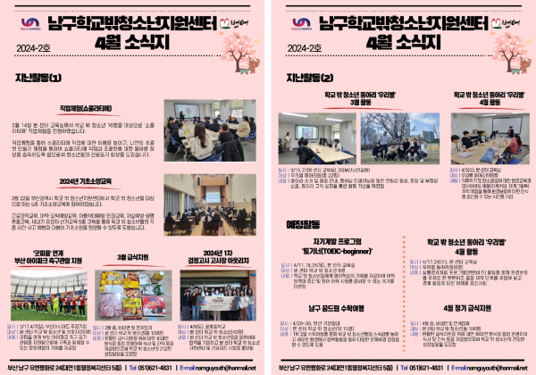 4월 소식지 페이지 정보 작성자 최고관리자 작성일24-04-11 14:19 조회142회 댓글0건 이전글 다음글 답변 목록 본문 남구청소년상담복지센터·남구학교밖청소년지원센터 4월 소식입니다:) 댓글목록 등록된 댓글이 없습니다. 이전글 다음글 답변 목록