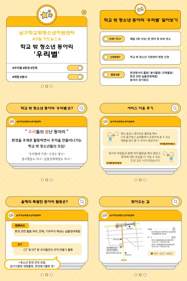 학교밖) 5월 카드뉴스 페이지 정보 작성자 최고관리자 작성일24-05-14 13:59 조회120회 댓글0건 이전글 다음글 답변 목록 본문 남구학교밖청소년지원센터 5월 카드뉴스입니다! 문의사항은 051-621-4831로 전화주세요:) 댓글목록 등록된 댓글이 없습니다. 이전글 다음글 답변 목록