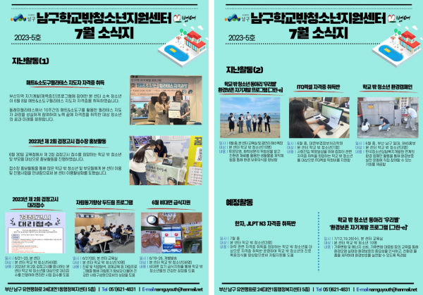 7월 소식지 페이지 정보 작성자 최고관리자 작성일23-07-12 14:01 조회250회 댓글0건 이전글 다음글 답변 목록 본문 남구청소년상담복지센터·남구학교밖청소년지원센터 7월 소식입니다:) 댓글목록 등록된 댓글이 없습니다. 이전글 다음글 답변 목록