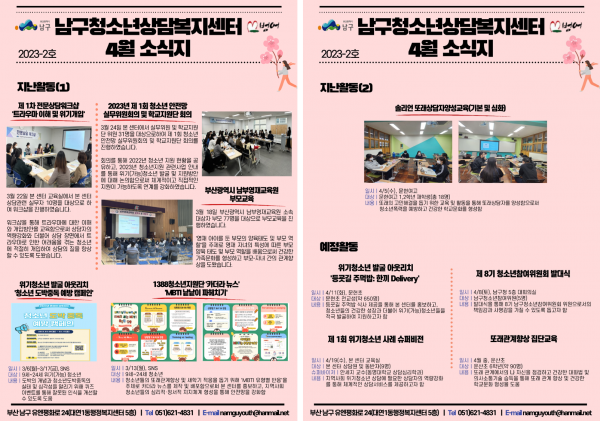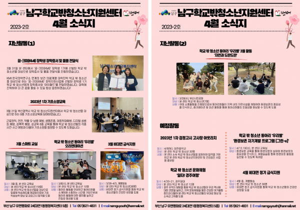4월 소식지 페이지 정보 작성자 최고관리자 작성일23-04-10 14:48 조회354회 댓글0건 이전글 다음글 답변 목록 본문 남구청소년상담복지센터·남구학교밖청소년지원센터 4월 소식입니다:) 댓글목록 등록된 댓글이 없습니다. 이전글 다음글 답변 목록