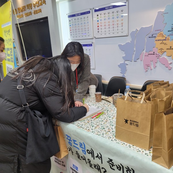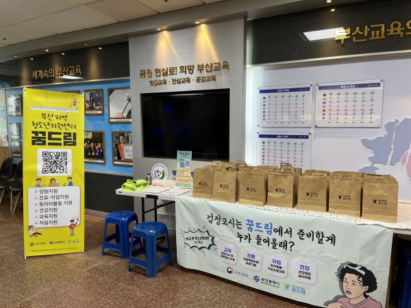 내용: 검정고시 원서접수장에서 학교 밖 청소년 및 학부모를 대상으로 부산 시군구 단위 꿈드림 센터들과 함께 연합 홍보활동을 진행하였습니다.