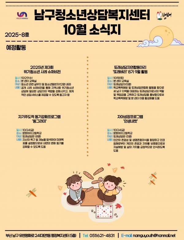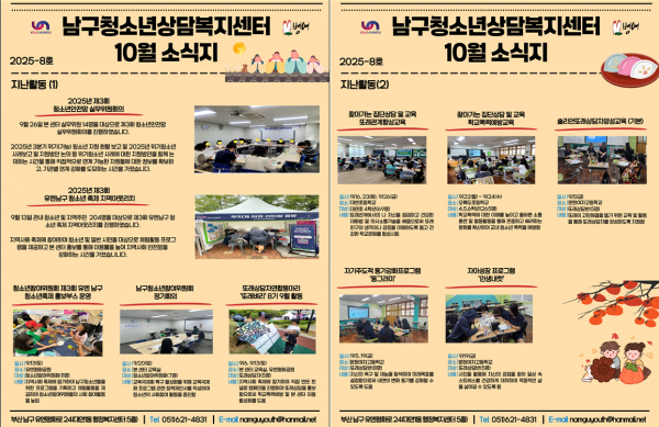 10월 소식지 페이지 정보 작성자 최고관리자 작성일25-10-02 17:10 조회49회 댓글0건 이전글 다음글 답변 목록 본문 남구청소년상담복지센터·남구학교밖청소년지원센터 9월 소식입니다 ! 댓글목록 등록된 댓글이 없습니다. 이전글 다음글 답변 목록