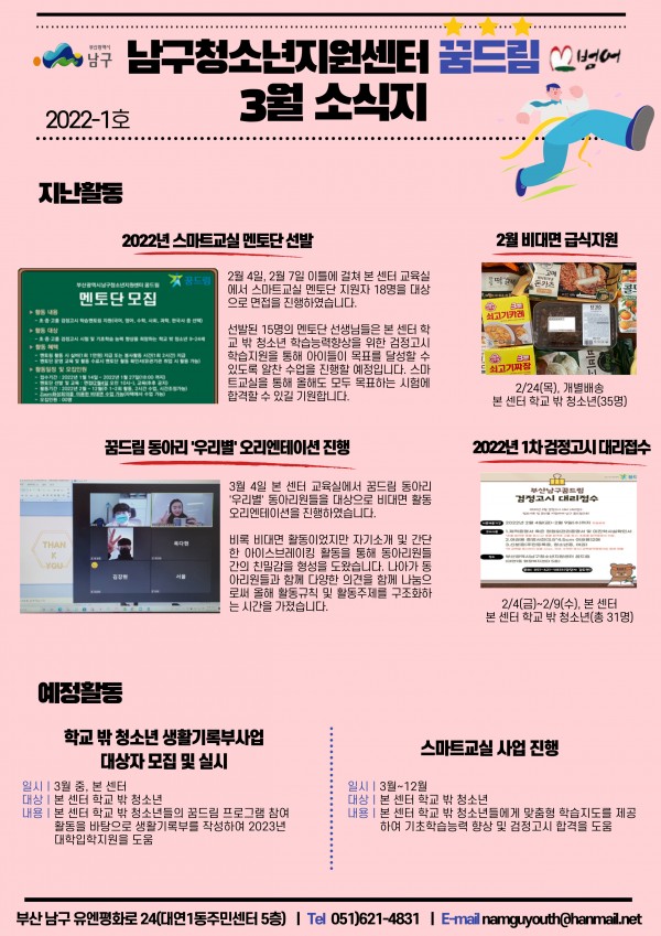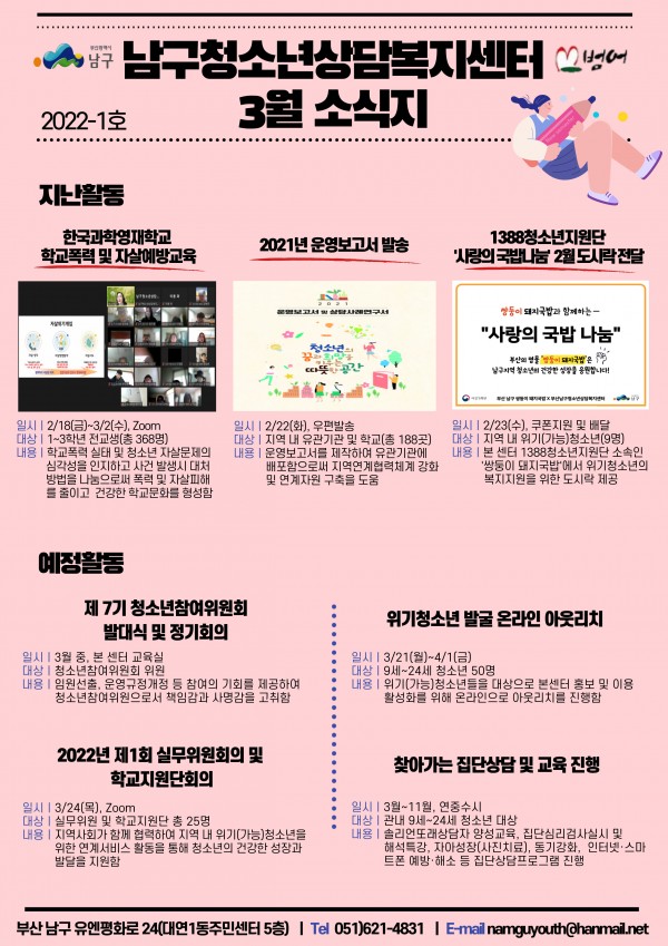 3월 소식지 페이지 정보 작성자 최고관리자 작성일22-03-21 09:01 조회1,049회 댓글0건 이전글 다음글 답변 목록 본문 남구청소년상담복지센터·남구꿈드림 3월소식입니다:) 댓글목록 등록된 댓글이 없습니다. 이전글 다음글 답변 목록