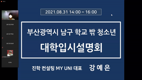 ❍ 내용 : 2022년도 대학 수시지원을 희망하는 남구 학교 밖 청소년 들을 위해 수시지원에 필요한 교육내용을 가지고 대학입시설명회를 진행함.