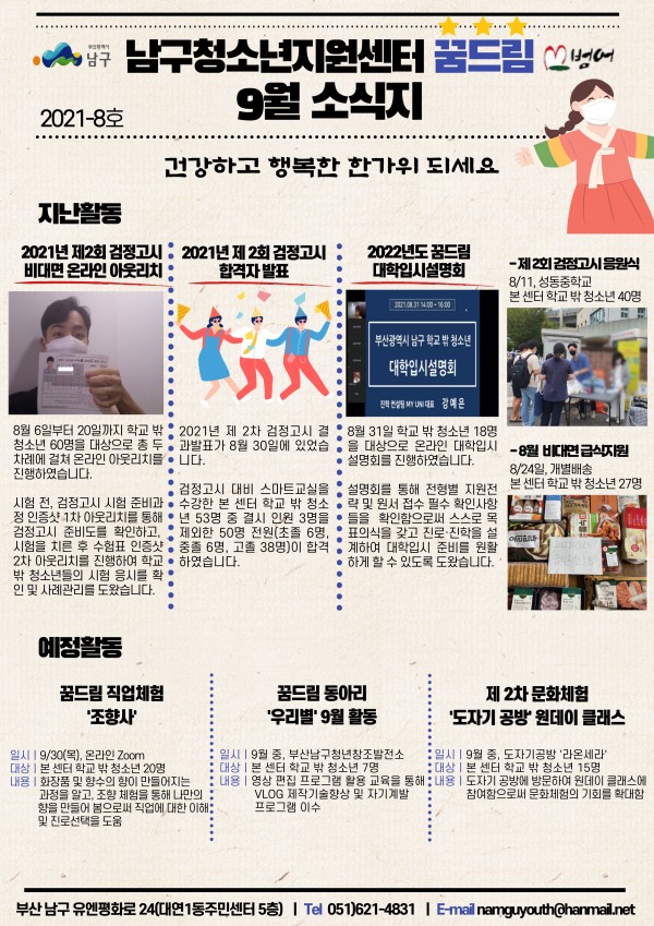 9월 소식지 페이지 정보 작성자 최고관리자 작성일21-09-08 15:23 조회1,453회 댓글0건 이전글 다음글 답변 목록 본문 남구청소년상담복지센터·남구꿈드림 9월소식입니다:) 댓글목록 등록된 댓글이 없습니다. 이전글 다음글 답변 목록
