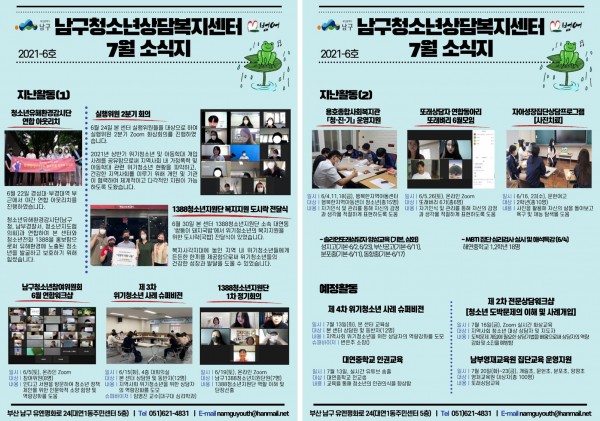 7월 소식지 페이지 정보 작성자 최고관리자 작성일21-07-12 13:12 조회1,624회 댓글0건 이전글 다음글 답변 목록 본문 남구청소년상담복지센터, 꿈드림 7월소식입니다~^^ 댓글목록 등록된 댓글이 없습니다. 이전글 다음글 답변 목록