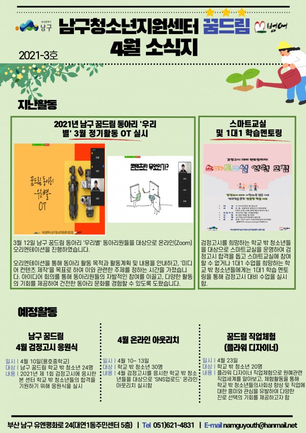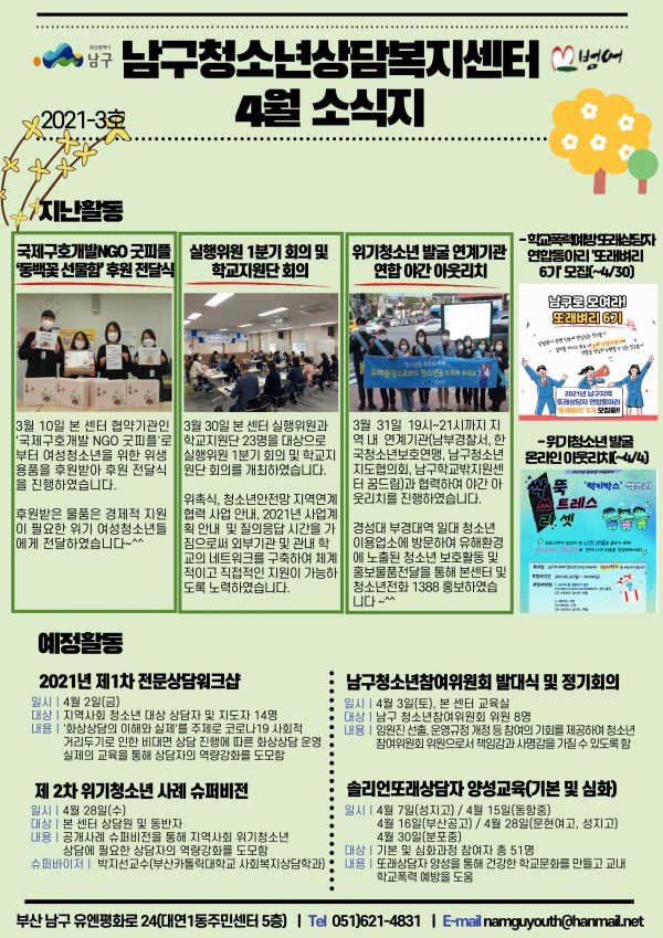 2021년 4월 소식지 페이지 정보 작성자 최고관리자 작성일21-04-09 09:12 조회1,964회 댓글0건 이전글 다음글 답변 목록 본문 남구청소년상담복지센터, 꿈드림 4월소식입니다~^^ 댓글목록 등록된 댓글이 없습니다. 이전글 다음글 답변 목록