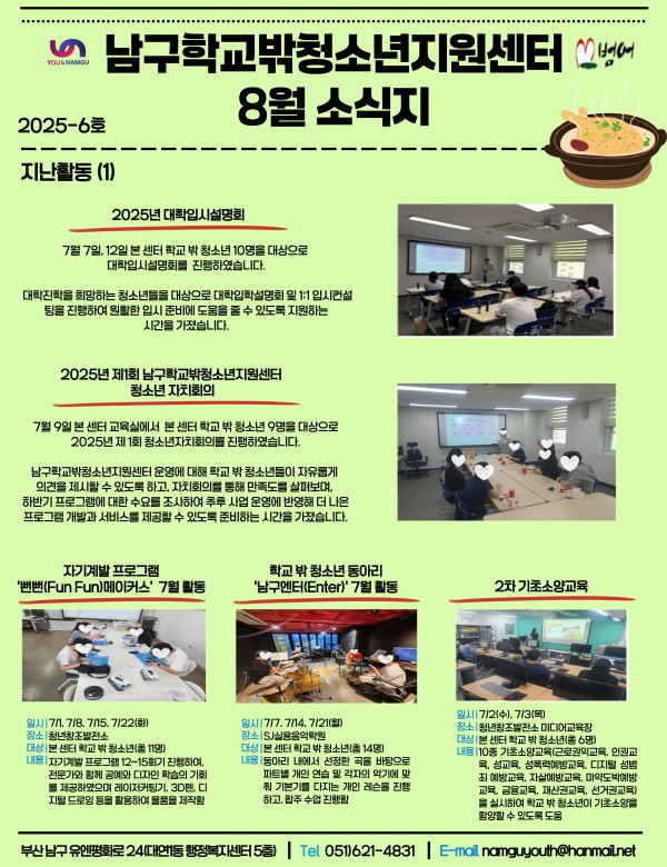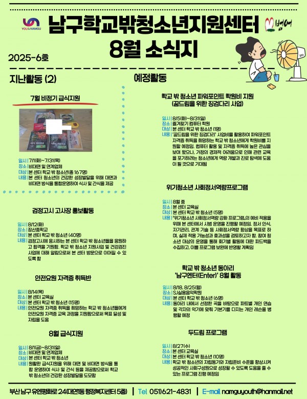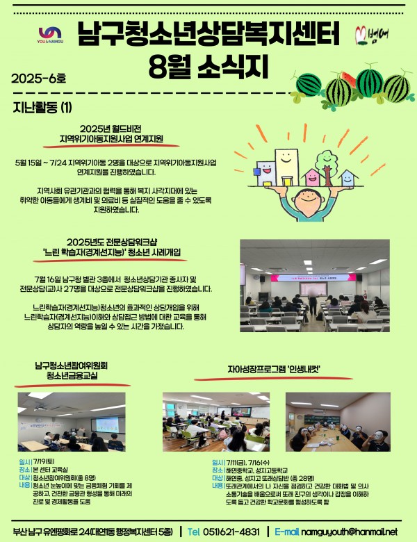 8월 소식지 페이지 정보 작성자 최고관리자 작성일25-08-13 15:09 조회44회 댓글0건 이전글 다음글 답변 목록 본문 남구청소년상담복지센터·남구학교밖청소년지원센터 8월 소식입니다 ! 댓글목록 등록된 댓글이 없습니다. 이전글 다음글 답변 목록