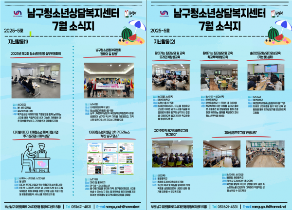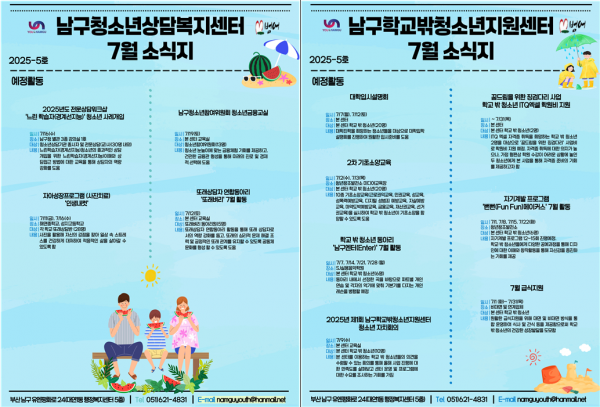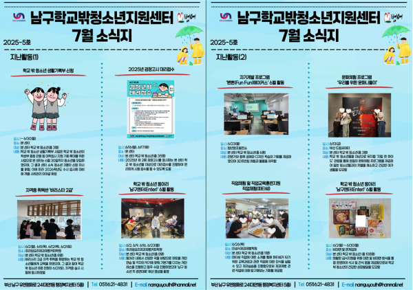 7월 소식지 페이지 정보 작성자 최고관리자 작성일25-07-04 11:40 조회59회 댓글0건 이전글 다음글 답변 목록 본문 남구청소년상담복지센터·남구학교밖청소년지원센터 7월 소식입니다 ! 댓글목록 등록된 댓글이 없습니다. 이전글 다음글 답변 목록