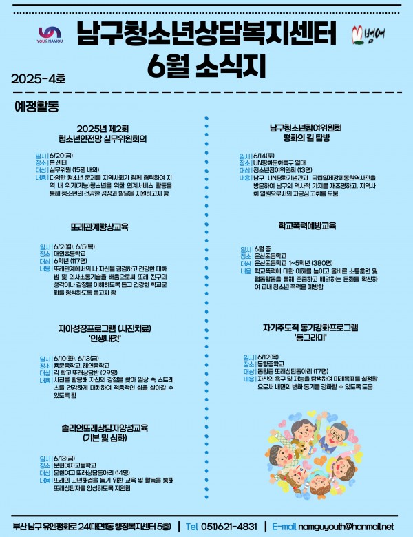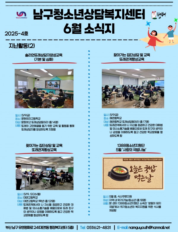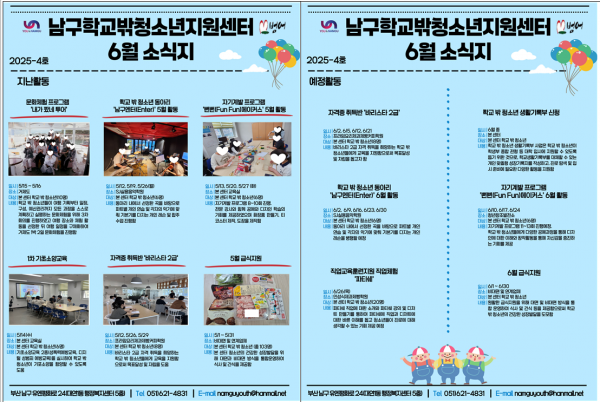 6월 소식지 페이지 정보 작성자 최고관리자 작성일25-06-17 10:26 조회44회 댓글0건 이전글 다음글 답변 목록 본문 남구청소년상담복지센터·남구학교밖청소년지원센터 6월 소식입니다 ! 댓글목록 등록된 댓글이 없습니다. 이전글 다음글 답변 목록