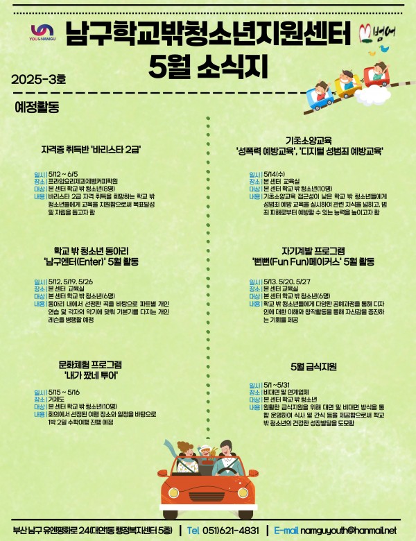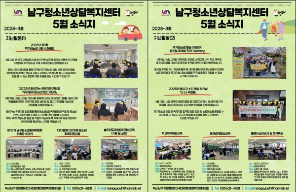 5월 소식 페이지 정보 작성자 최고관리자 작성일25-05-13 15:58 조회64회 댓글0건 이전글 다음글 답변 목록 본문 남구청소년상담복지센터·남구학교밖청소년지원센터 5월 소식입니다 ! :) 댓글목록 등록된 댓글이 없습니다. 이전글 다음글 답변 목록