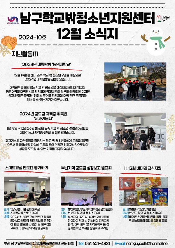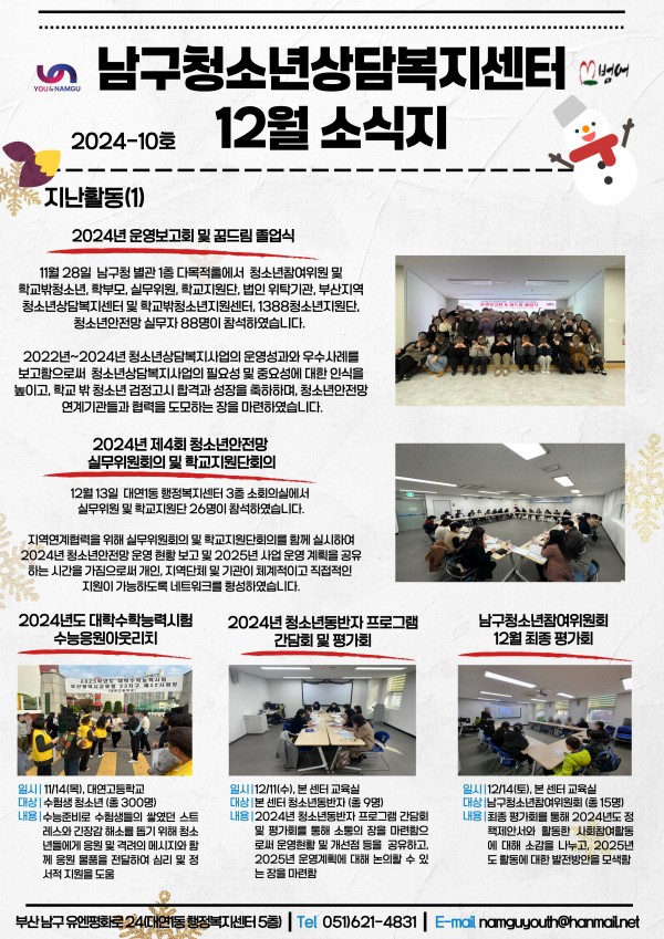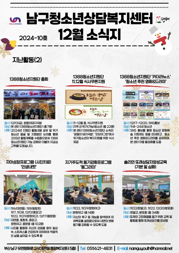 12월 소식지 페이지 정보 작성자 최고관리자 작성일25-01-13 13:39 조회97회 댓글0건 이전글 다음글 답변 목록 본문 남구청소년상담복지센터·남구학교밖청소년지원센터 12월 소식입니다:) 댓글목록 등록된 댓글이 없습니다. 이전글 다음글 답변 목록