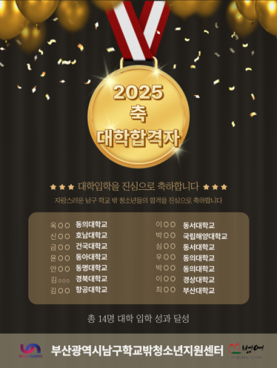 학교밖) 2025학년도 대학합격 페이지 정보 작성자 최고관리자 작성일25-03-04 17:32 조회55회 댓글0건 이전글 다음글 답변 목록 본문 대학에 합격한 14명의 학교 밖 청소년들을 진심으로 축하합니다. 남구 꿈드림이 여러분을 항상 응원하겠습니다~! 댓글목록 등록된 댓글이 없습니다. 이전글 다음글 답변 목록