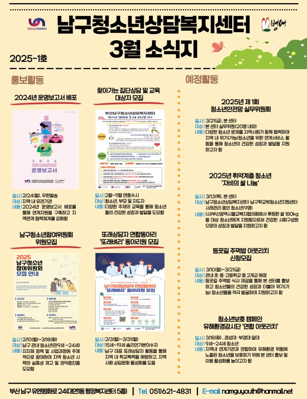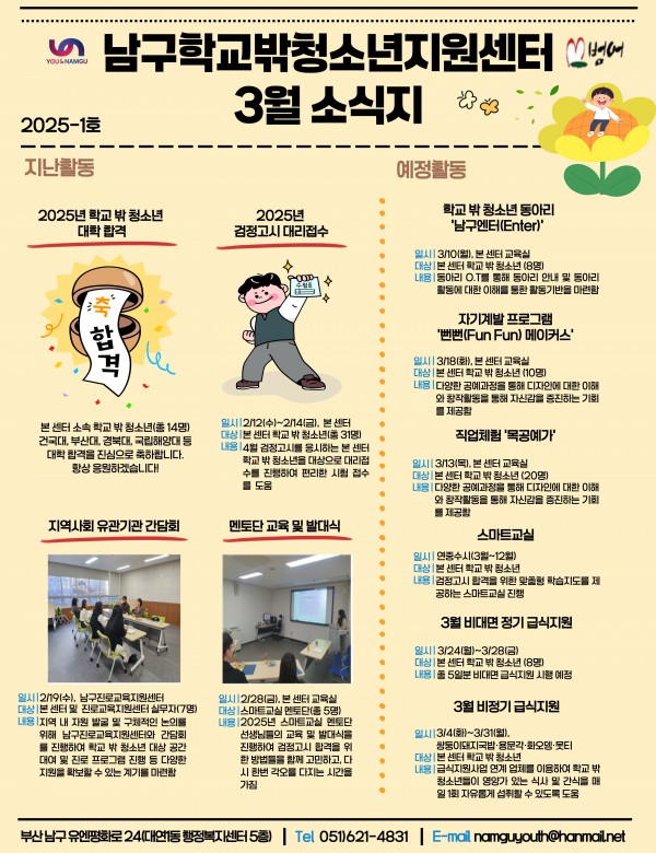 3월 소식지 페이지 정보 작성자 최고관리자 작성일25-03-07 14:40 조회64회 댓글0건 이전글 다음글 답변 목록 본문 남구청소년상담복지센터·남구학교밖청소년지원센터 3월 소식입니다:) 댓글목록 등록된 댓글이 없습니다. 이전글 다음글 답변 목록