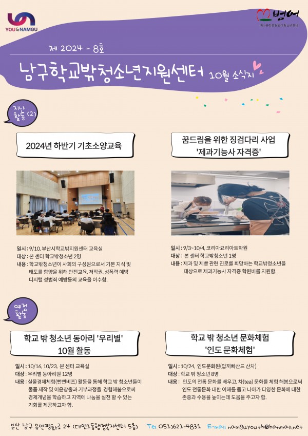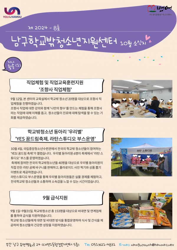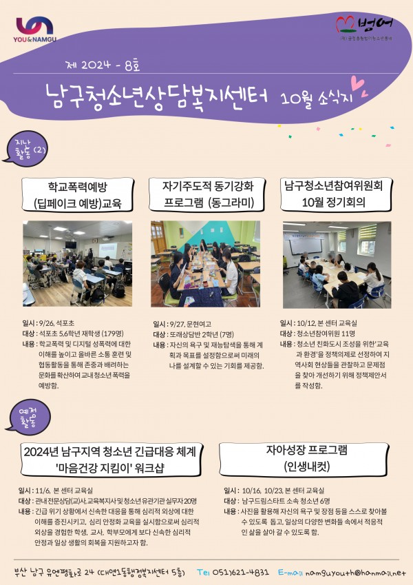 남구청소년상담복지센터&남구학교밖지원센터10월 소식지 페이지 정보 작성자 최고관리자 작성일24-10-17 13:28 조회89회 댓글0건 이전글 다음글 답변 목록 본문 남구청소년상담복지센터 및 남구학교밖지원센터 10월 소식지 입니다 댓글목록 등록된 댓글이 없습니다. 이전글 다음글 답변 목록