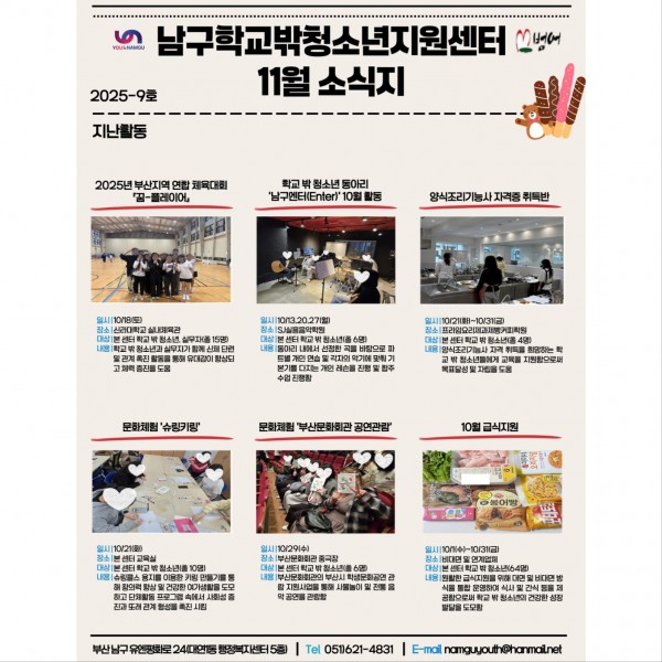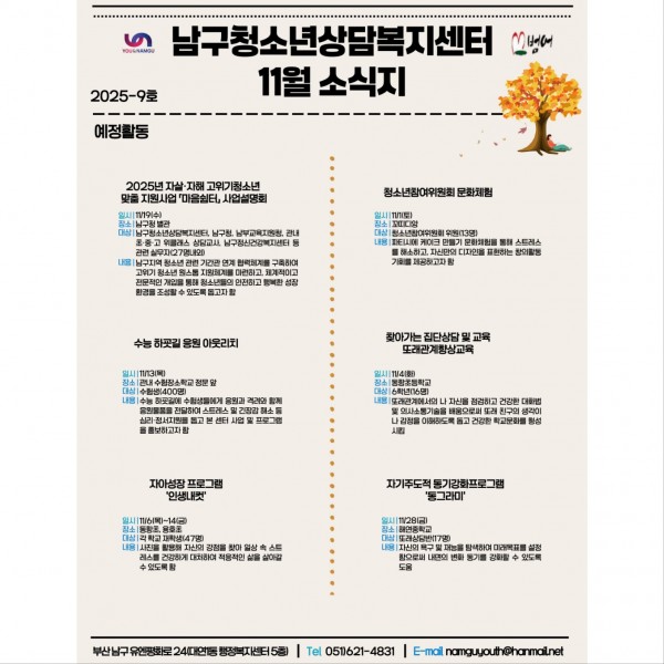 11월 소식지 페이지 정보 작성자 최고관리자 작성일25-11-12 14:46 조회34회 댓글0건 이전글 다음글 답변 목록 본문 남구청소년상담복지센터·남구학교밖청소년지원센터 11월 소식입니다 ! 댓글목록 등록된 댓글이 없습니다. 이전글 다음글 답변 목록