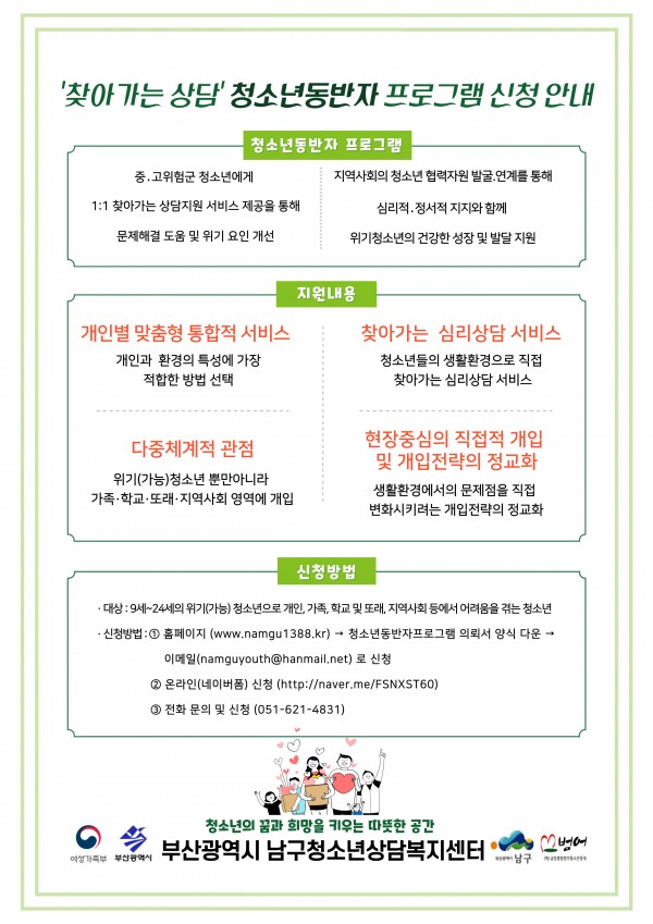 신청을 원하시는 분은 아래의 청소년동반자 의뢰서 양식을 다운받아 작성하신 뒤 이메일(namguyouth@hanmail.net)로 신청해주시거나,