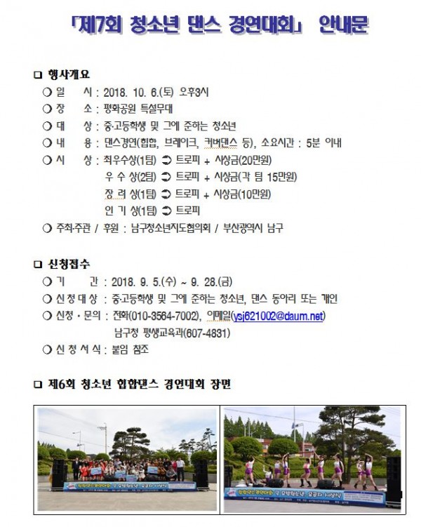 제7회 청소년 댄스 경연대회 페이지 정보 작성자 최고관리자 작성일18-09-05 11:39 조회13,180회 댓글0건 본문 많은 관심 부탁드립니다. *자세한 사항은 남구청 홈페이지를 방문해 보세요 이전글 다음글 목록