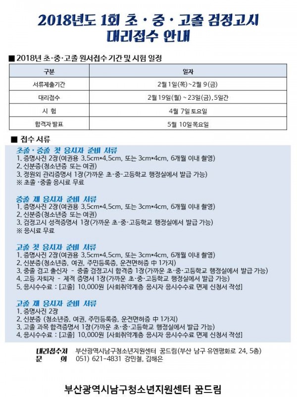 2018 1회 검정고시 대리접수 안내