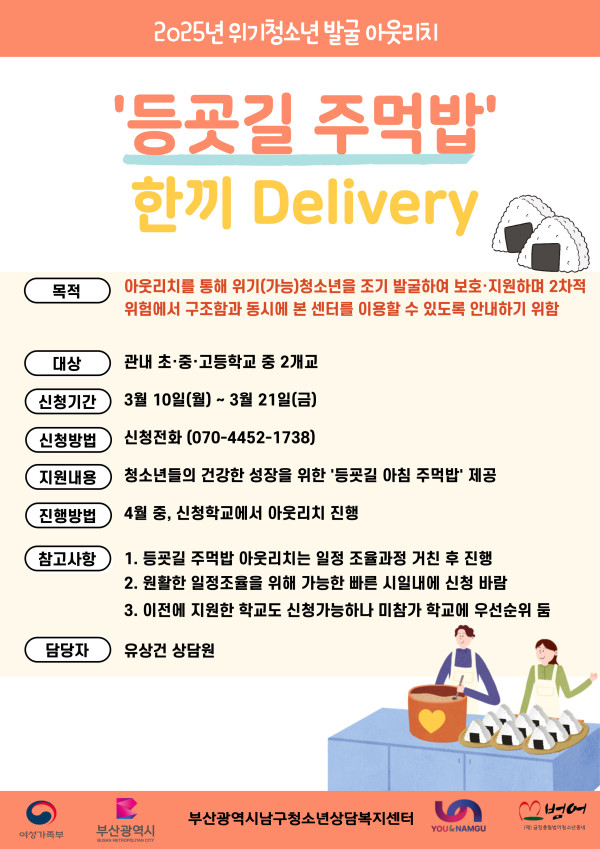 2025년 위기청소년 발굴 ‘등굣길 주먹밥’ 아웃리치 페이지 정보 작성자 최고관리자 작성일25-03-04 15:09 조회199회 댓글0건 본문 많은 관심과 참여 부탁드립니다^^ 이전글 다음글 목록
