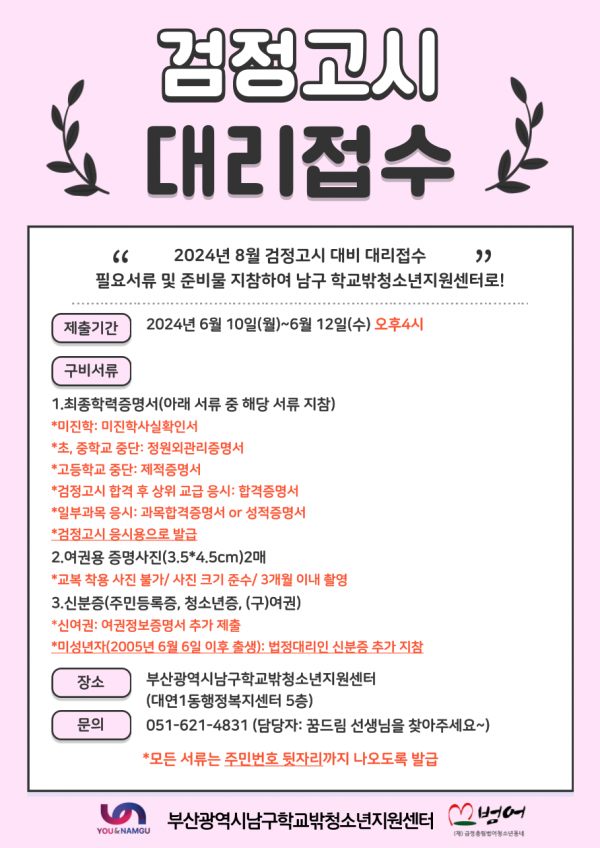 2024년 제2회 검정고시 대리접수 페이지 정보 작성자 최고관리자 작성일24-06-07 13:26 조회213회 댓글0건 본문 2024년 제2회 검정고시 대리접수가 6/10(월)~6/12(수) 오후4시까지 진행됩니다. 필요 서류와 준비물 챙기셔서 센터 방문해주시면 됩니다^^ 이전글 다음글 목록