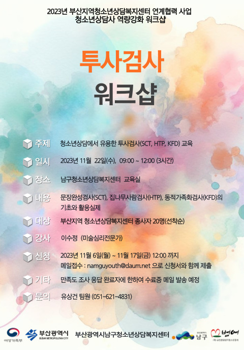 2023년 부산지역청소년상담복지센터 연계협력 사업 ‘청소년상담사 역량강화 워크샵’ [투사검사 워크샵] 안내