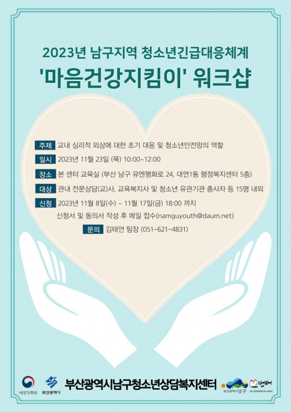 본 센터에서 2023년 남구지역 청소년긴급대응체계 '마음건강지킴이' 워크샵을 다음과 같이 운영하고자 하오니 많은 관심과 참여 부탁드립니다.