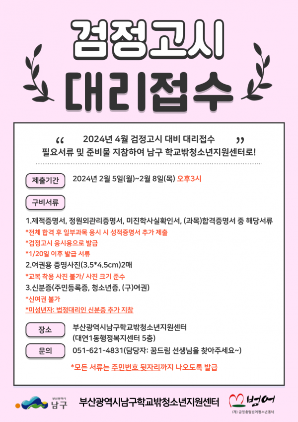 2024년 제1회 검정고시 대리접수 페이지 정보 작성자 최고관리자 작성일24-02-02 14:40 조회277회 댓글0건 본문 2024년 제1회 검정고시 대리접수가 2/5(월)~2/8(목) 오후3시까지 진행됩니다. 필요 서류와 준비물 챙기셔서 센터 방문해주시면 됩니다^^ 이전글 다음글 목록