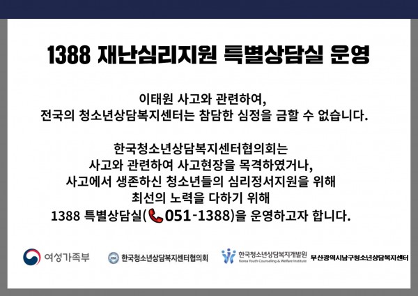 1388 재난심리지원 특별상담실 운영 > 공지사항