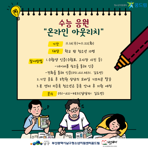 수능 응원 온라인 아웃리치를 진행합니다! 많은 관심과 참여 부탁드립니다~