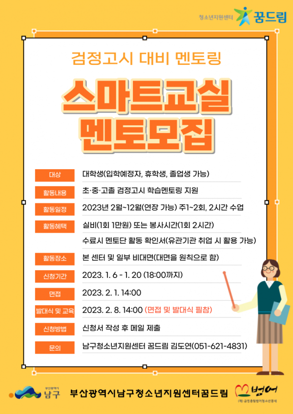 [부산광역시남구청소년지원센터 꿈드림 멘토단 모집 안내]