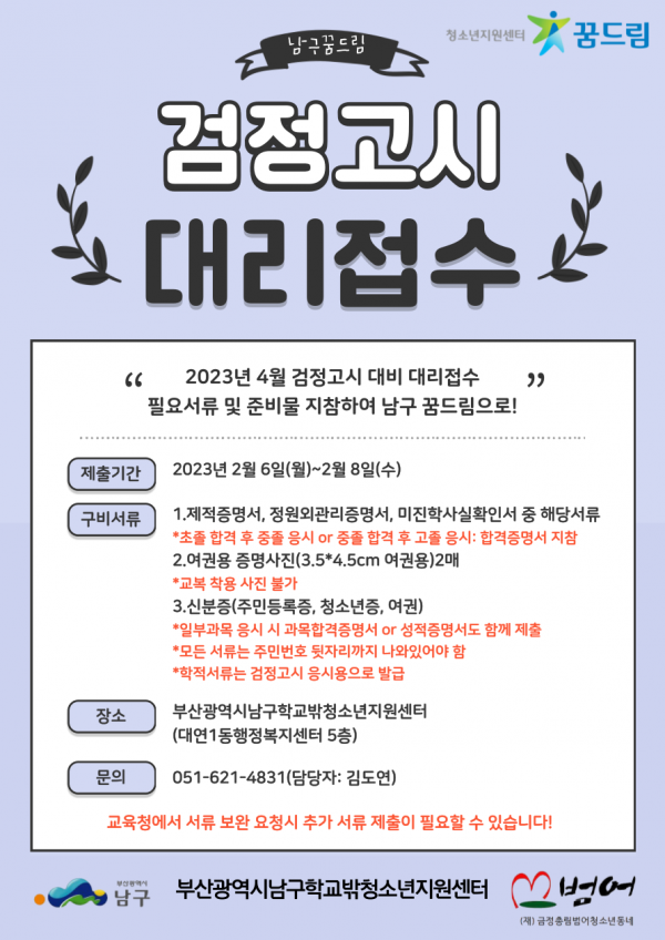 2023년 제1회 검정고시 대리접수 페이지 정보 작성자 최고관리자 작성일23-02-03 10:24 조회1,035회 댓글0건 본문 2023년 제1회 검정고시 대리접수가 2/6(월)~2/8(수)까지 진행됩니다. 필요서류와 준비물 챙기셔서 센터 방문해주시면 됩니다^^ 이전글 다음글 목록