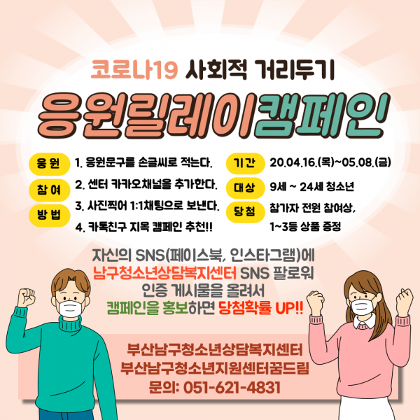 #부산광역시남구청소년상담복지센터에서는 길어지는 사회적 거리두기로 인해 지친 마음을 위로하고 다함께 극복할 수 있도록 #코로나19 #사회적 거리두기 #응원릴레이 캠페인을 실시하고자 합니다.