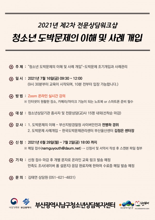 2021년 제2차 전문상담워크샵 [청소년 도박문제의 이해 및 사례 개입] 안내