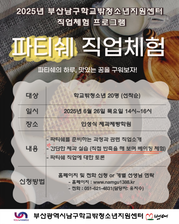 남구학교밖청소년지원센터 직업체험(파티쉐) 프로그램 참여 청소년 모집