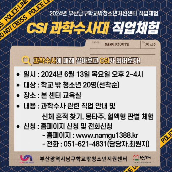 남구학교밖청소년지원센터 직업체험(CSI 과학수사대) 프로그램 참여자 모집