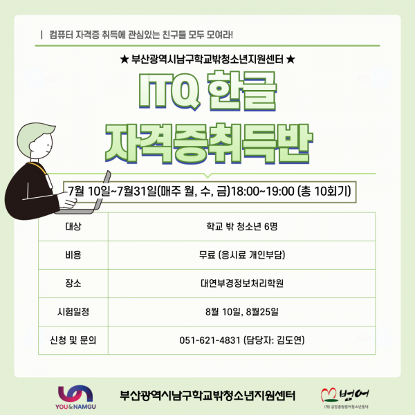 남구학교밖청소년지원센터 자격증 취득반(ITQ한글) 인원 모집