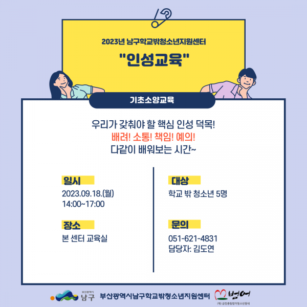 남구 꿈드림 기초소양교육 '인성 교육' 참여자 모집 페이지 정보 작성자 최고관리자 작성일23-09-15 14:21 조회208회 댓글0건 첨부파일 안녕하십니까. 부산남구학교밖청소년지원센터에서 기초소양교육 중 하나인 '인성 교육'참여자를 모집합니다. 일시: 2023년 9월 18일(월), 14:00~17:00 내용: 청소년 인성교육 '올바름' 대상: 학교밖청소년 00명 문의: 051-621-4831(안재원)