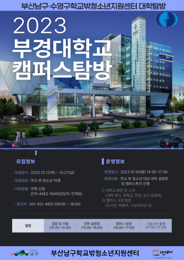 남구학교밖청소년지원센터 부경대학교 대학탐방 참여자 모집 페이지 정보 작성자 최고관리자 작성일23-10-18 16:32 조회229회 댓글0건 첨부파일 일시 : 10월 30일(월), 14:30~17:30 장소 : 부경대학교 캠퍼스 내용 : 부경대학교 캠퍼스 투어 및 입시설명회, 학과 소개 등 문의 : 051-621-4831(안재원)