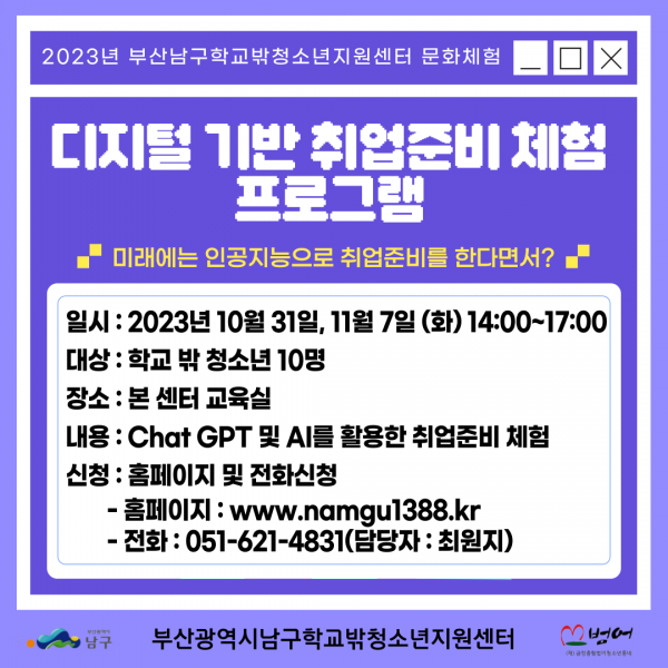 남구학교밖청소년지원센터 문화체험(디지털 기반 취업준비 체험) 참여자 모집