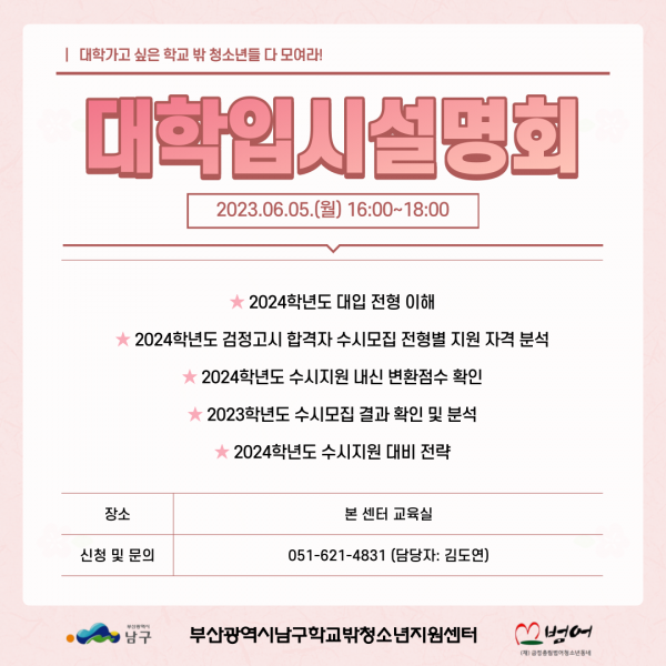남구학교밖청소년지원센터 대학입시설명회 참여 인원 모집