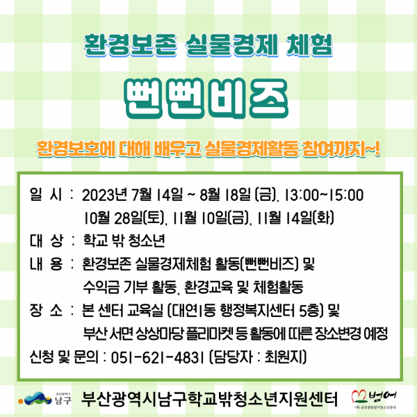 남구학교밖청소년지원센터 환경보존 실물경제체험 프로그램(뻔뻔비즈) 참여 인원 모집