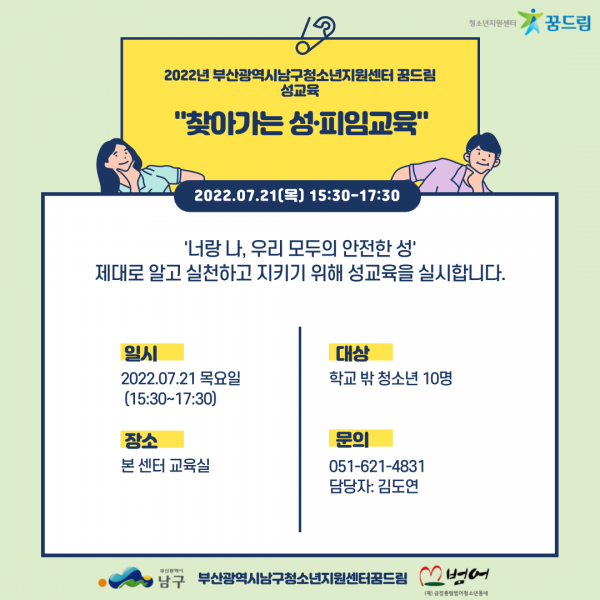 남구 꿈드림 성교육 참여 인원 모집 페이지 정보 작성자 최고관리자 작성일22-07-07 09:21 조회1,205회 댓글0건 첨부파일 남구 꿈드림센터에서 학교 밖 청소년을 대상으로 성교육을 진행 할 예정입니다~ 많은 관심과 참여 부탁드립니다.^^ 일시 : 2022년 7월 21일(목) 15:30-17:30 장소 : 본 센터 교육실 인원 : 학교 밖 청소년 10명 문의 : 051-621-4831(김도연)