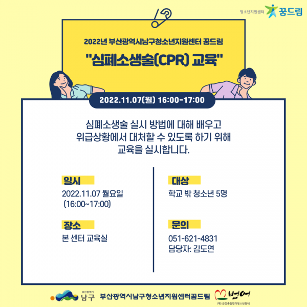 남구 꿈드림 심폐소생술(CPR) 교육 참여 인원 모집 페이지 정보 작성자 최고관리자 작성일22-11-02 17:29 조회894회 댓글0건 첨부파일 남구 꿈드림센터에서 학교 밖 청소년을 대상으로 심폐소생술(CPR)교육을 실시할 예정입니다~ 많은 관심과 참여 부탁드립니다.^^ 일시 : 2022년 11월 7일(월) 16:00~17:00 장소 : 본 센터 교육실 인원 : 학교 밖 청소년 5명 문의 : 051-621-4831(김도연)