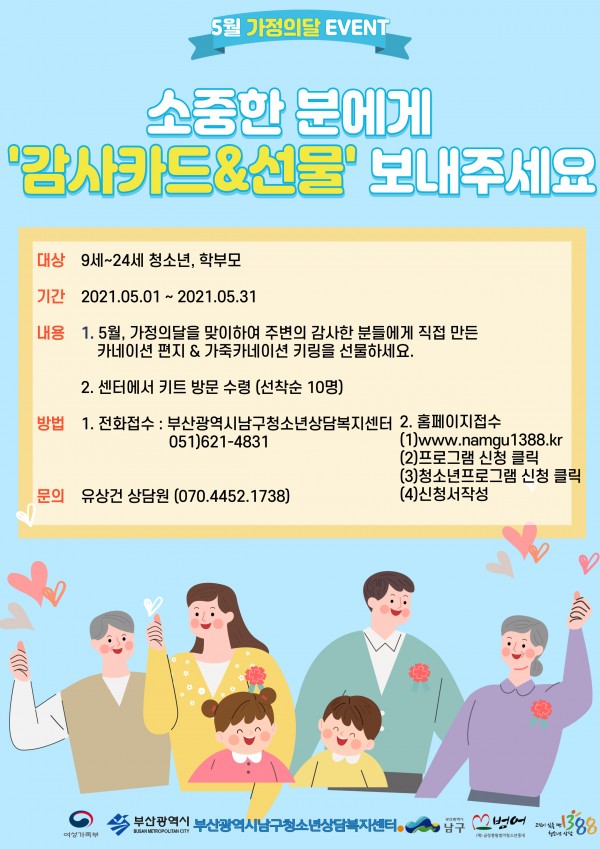 5월가정의 달 EVENT (감사카드 & 가죽카네이션키링 만들기 키트 제공) 페이지 정보 작성자 최고관리자 작성일21-04-27 15:13 조회2,536회 댓글9건 첨부파일 5월 가정의달을 맞이하여 감사카드&카네이션가죽 키링을 직접만들어 소중한 사람에게 선물할수 있는 키트를 제공합니다.~! 신청방법과 수령방법은 포스터를 참고하세요~!