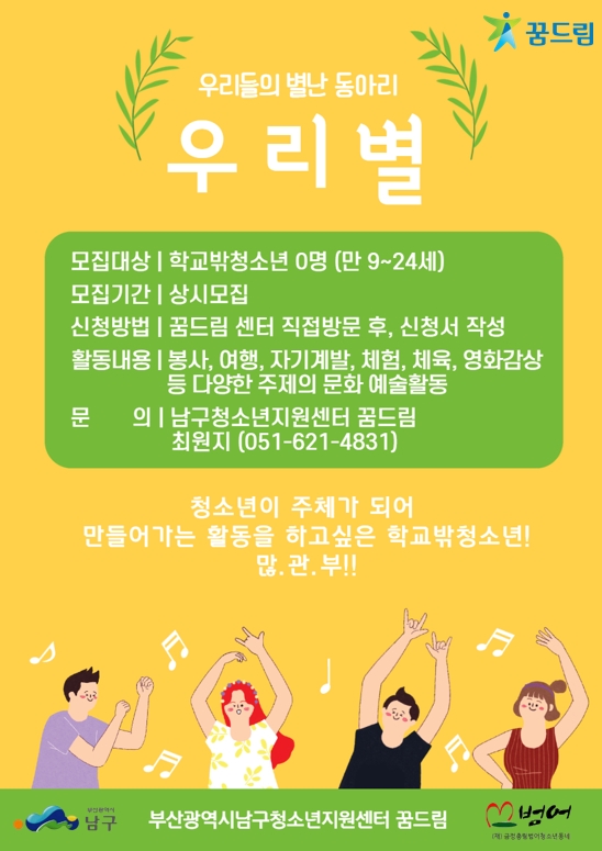 꿈드림 ) 학교밖청소년 동아리 '우리별' 동아리원 모집 페이지 정보 작성자 최고관리자 작성일22-02-14 11:10 조회1,880회 댓글0건 첨부파일 남구청소년지원센터 꿈드림에서 청소년 동아리 '우리별' 활동을 할 청소년들을 모집합니다. 봉사, 여행, 자기계발, 체험, 체육, 영화감상, 사진활동 등 다양한 주제의 문화 및 예술활동을 할 예정이오니 관심있는 청소년들의 많은 참여 바랍니다. :)