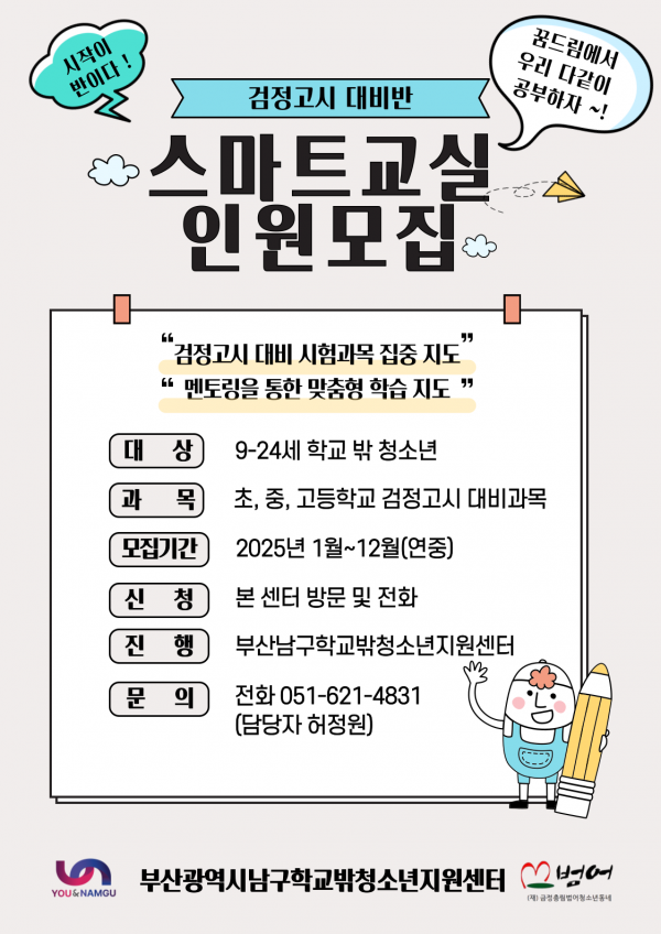 2025년 검정고시/수능 대비 스마트교실 참여 인원 모집 페이지 정보 작성자 최고관리자 작성일24-02-16 10:01 조회515회 댓글2건 첨부파일 검정고시/수능 대비 스마트교실 수업 참여 인원을 모집합니다! 일시 : 연중수시/월별 시간표에 따라 수업 진행 장소 : 남구학교밖청소년지원센터 교육실(대연1동 행정복지센터 5층) 대상 : 학교 밖 청소년 문의 : 051-621-4831