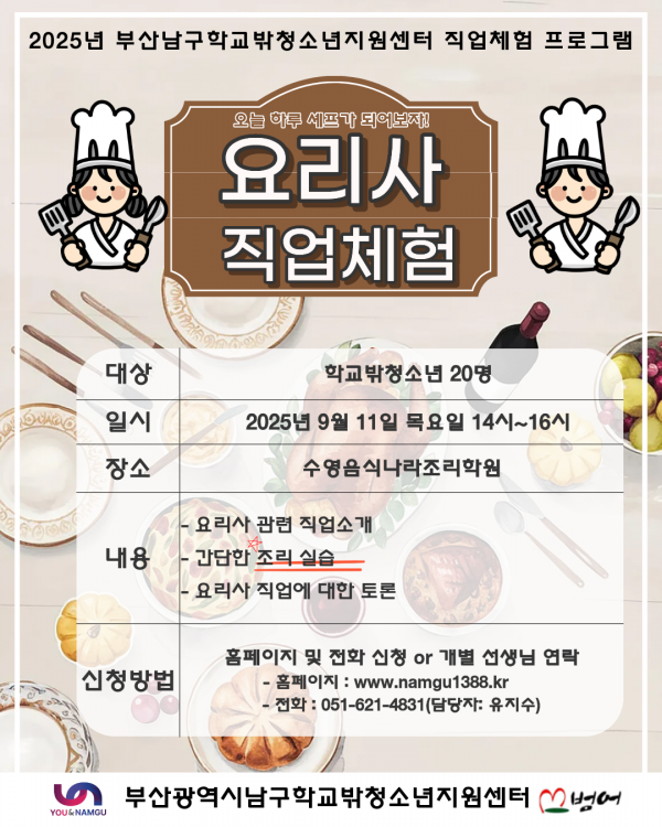 남구학교밖청소년지원센터 직업체험(요리사) 프로그램 참여 청소년 모집