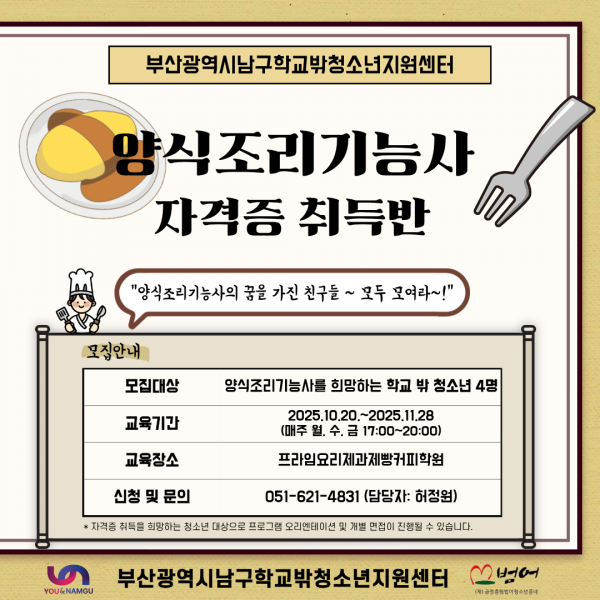 남구학교밖청소년지원센터 자격증취득반(양식조리기능사) 참여 청소년 모집